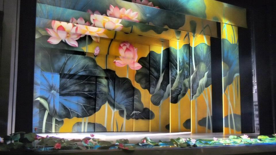 在高雄的場館中,大家最的熟悉的文化中心至德堂就算是一種標準的鏡框式舞台。而這樣子的舞台最特別的是當你側著看的時候可以發現舞台會呈現一層一層的樣子,如果以近期的演出來譬喻的話,雲門舞集的九歌,就有華麗的鏡框式舞台。既然都提到九歌,那就讓我們來看看那漂亮又絢麗的荷花佈景吧。